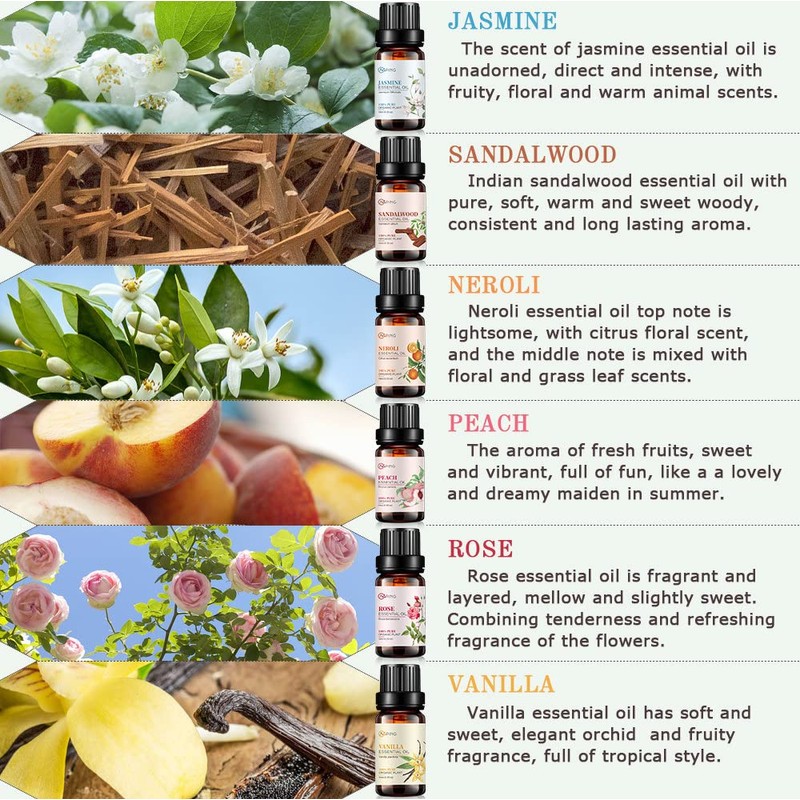• Benefits of Aromatherapy - AOPING essential oil molecules are very micro, through diffusing, bathing, massaging and other ways to effect the body and mind. The warm woody scent of this essential oil set is very suitable for meditation, and can make you calm and clear mind, relax the body, release stress, invigorate emotions, relieve negativity and sadness. It is good for feelings of weakness, malaise and exhaustion.