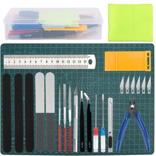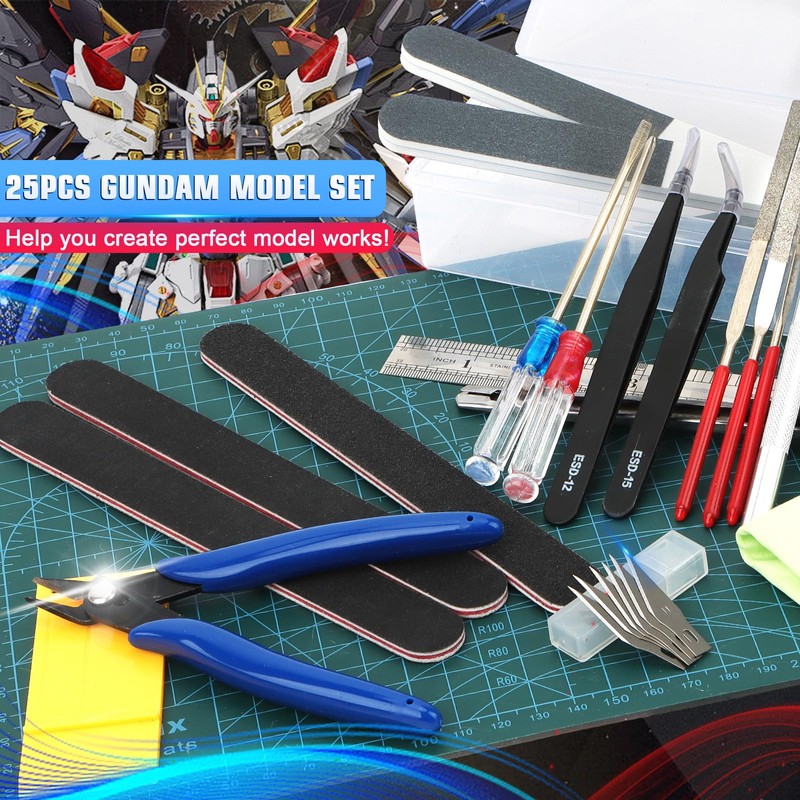 - 【ESSENTIAL TOOLS FOR HOBBY BUILDING】This kit includes 25 basic tools for Gundam model building: 1x A4 cutting board; 1x carving knife; 5x blades; 1x cutting pliers; 2x tweezers; 2x screwdrivers; 3x sanding strips; 1x steel ruler; 1x pocket knife; 5x polishing stick; 1x divider; 1x polishing cloth; 1x storage box. Covering everything from cutting, sanding, engraving, to disassembling, providing comprehensive support for your model-making endeavors.