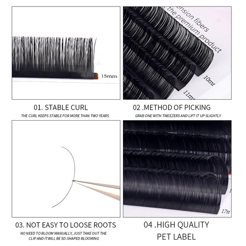 • 1.Cashmere individual eyelash extensions tray. 0.05 thickness, D curl, 10-17mm single length.super soft and lightweight cashmere fibers. It's more elastic, softer, and the fluffy fan is more similar to natural eyelashes, with a better matte black effect.
