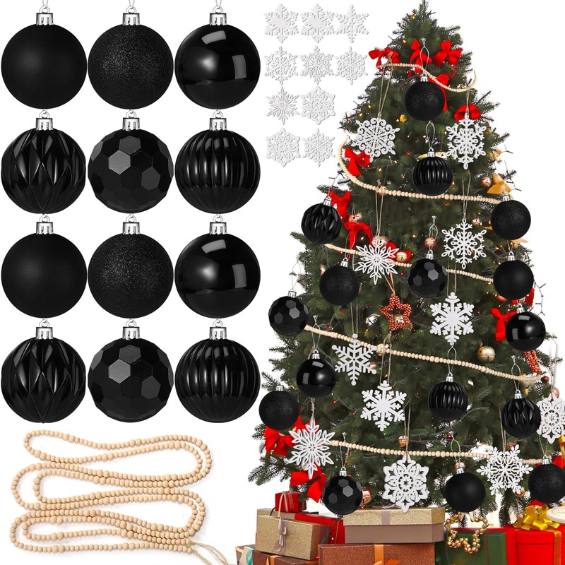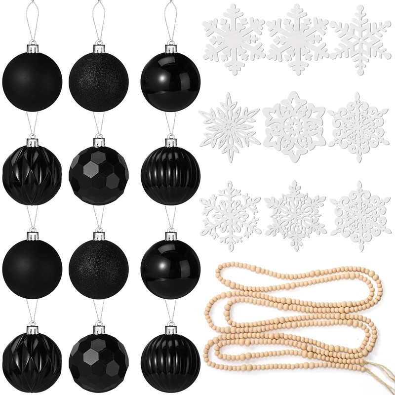 - Black Christmas Tree Decoration: this black Christmas decorations set includes 34 retro rural style 2.36 inches black Christmas ball ornaments in 6 different styles, 10 adorable wooden snowflakes, and a string of 2.95 yd wooden beads, allowing you to create a warm and rustic country festival atmosphere