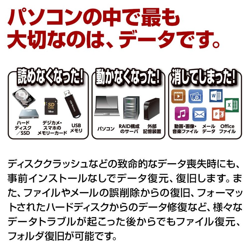 - ディスククラッシュ等の致命的なデータ喪失も、事前インストールなしで起動できるデータ復旧・復元ソフトです。ファイル・メール・画像・動画の誤削除、フォーマットされたHDD(ハードディスク)、PC(パソコン)のトラブルもリカバリー可能です。