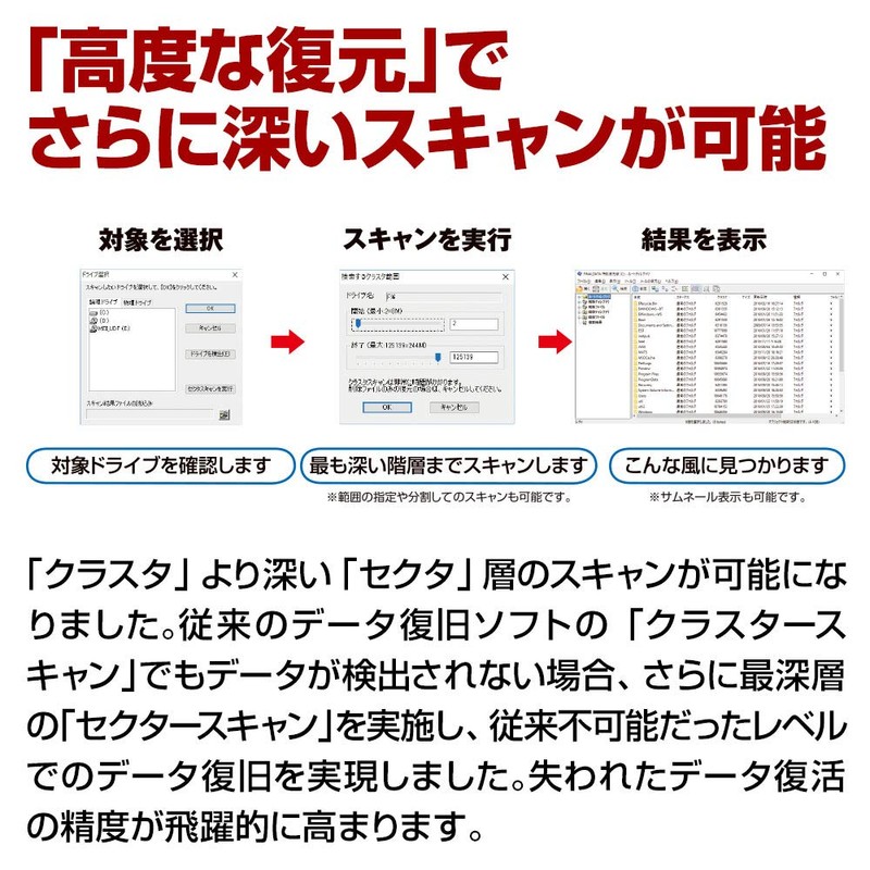 - 「クラスタ」より深い「セクタ」層のスキャンが可能になりました。従来のデータ復元ソフトの「クラスタースキャン」でもデータが検出されない場合、さらに最深層の「セクタースキャン」を行うことで、失われたデータ復活の精度が飛躍的に高まります。