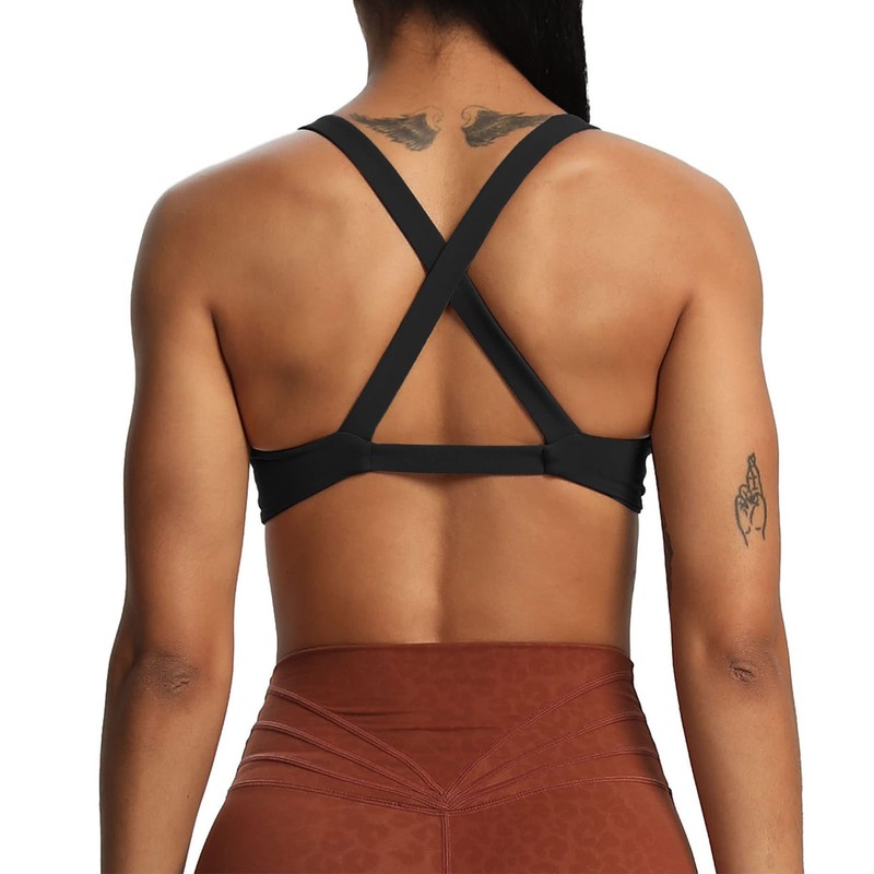 - The Satara twist womens sports bra featuring crossed back straps and padding, thick strap to get more support than our sienna sports bras