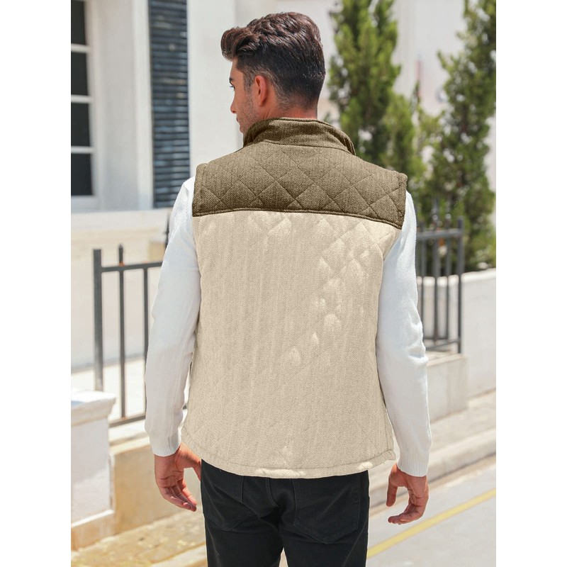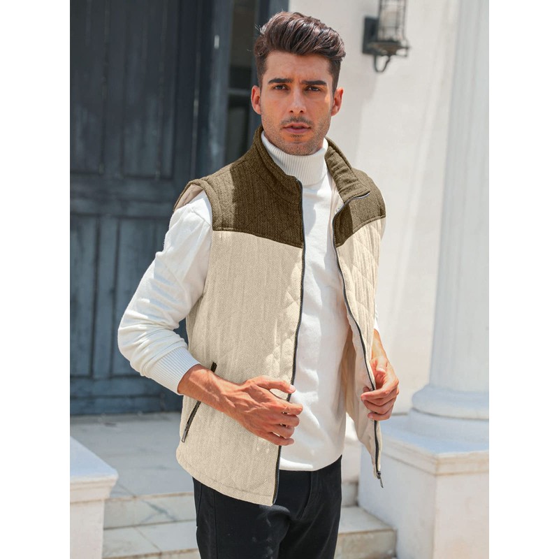 Men's Stand Collar Full Zip Slim Fit Fleece Vest Fashion Color Block Winter Padded Midweight Waistcoat