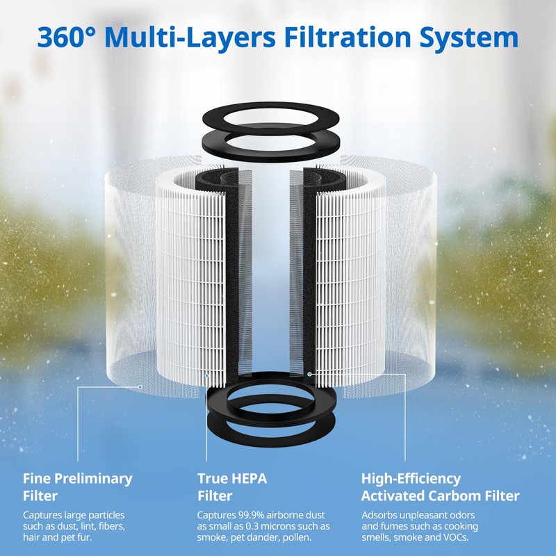 • 360ยฐ 3-in-1 Filtration System: The AP-T30 replacement filter for HoMedics is a totalclean 360ยฐ Filtration, 5 layers 3 in 1 filter. H13 True HEPA Filter, high-efficiency activated carbon, and Pre-Filter work together to capture up to 99.97 percent of particles down to 0.03 microns. The filter is manufactured under the strictest quality standards for maintaining your machine's peak performance, keeping your home free from dust, improving your indoor air quality to breathe and sleep at ease.