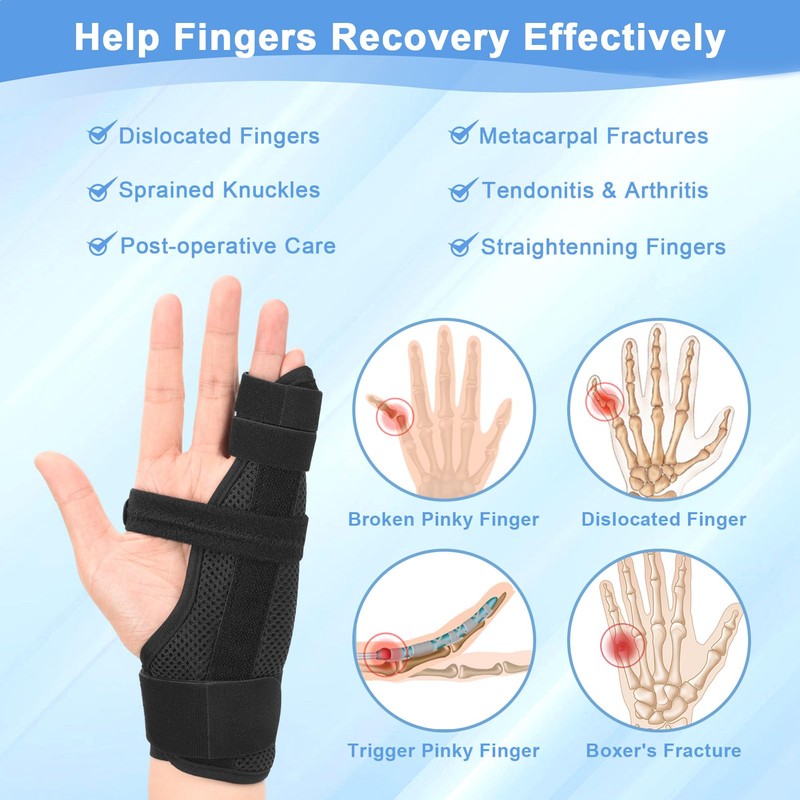 - MULTI-PURPOSE SUPPORT:The Pinky Finger Splint is designed to provide effective relief for a variety of hand injuries, including fractures, sprains, tendonitis, arthritis, and knuckle pain. Ideal for healing 4th and 5th metacarpal breaks, post-surgery recovery, and daily pain management. The Boxer Splint offers both daytime and nighttime support, ensuring continuous protection and comfort