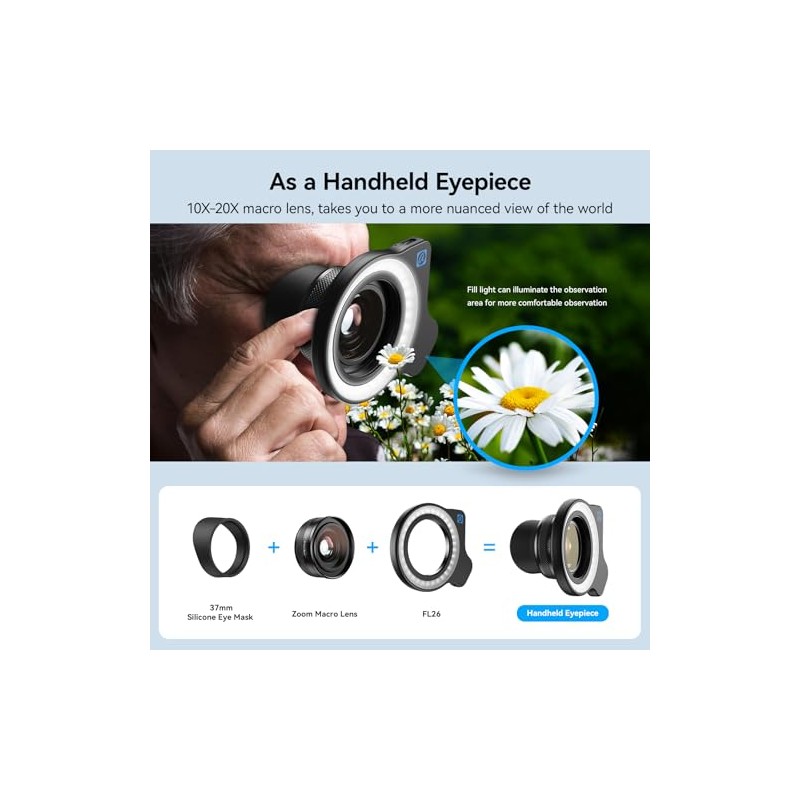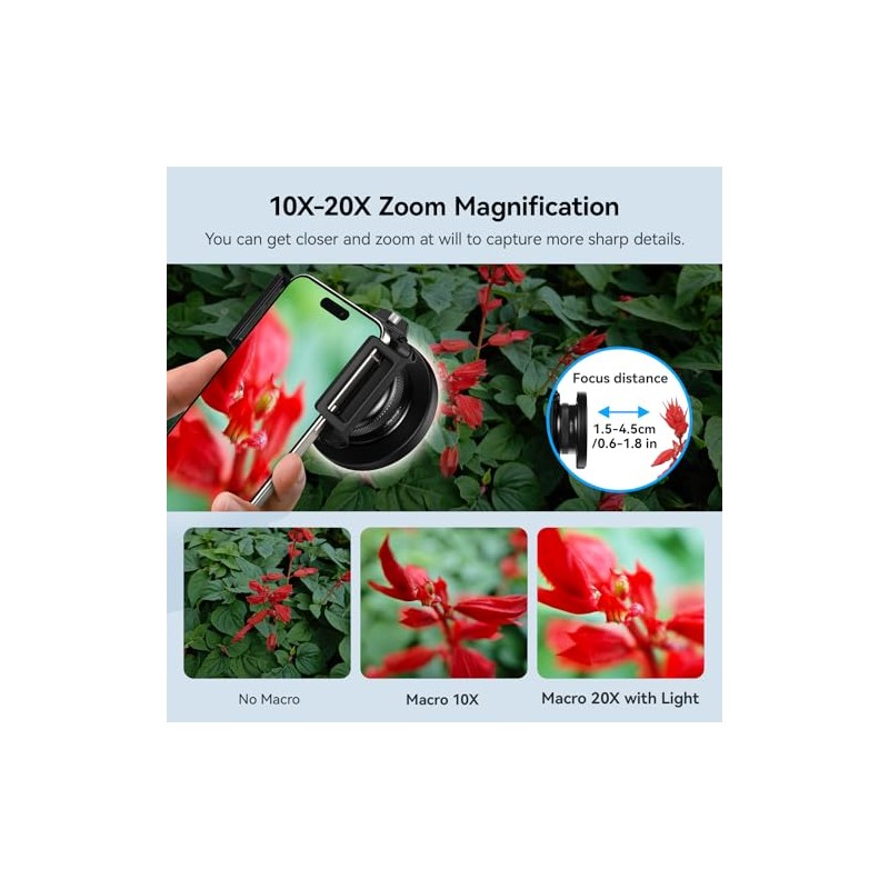 - 10-20X Precision ZoomAdopting ultra-precise rotating telescopic lens structure, it can realize 10-20X smooth zoom, enjoying the same operation experience as a DSLR camera and better capturing the details of the subject. Supports 0.6-inch ultra-close-up shooting to capture complex details more clearly. Super high image clarity, designed for macro photography enthusiasts, for cell phone still life close-ups on insects and plants, nail art and beauty details, jewelry, food, figure models and other small objects