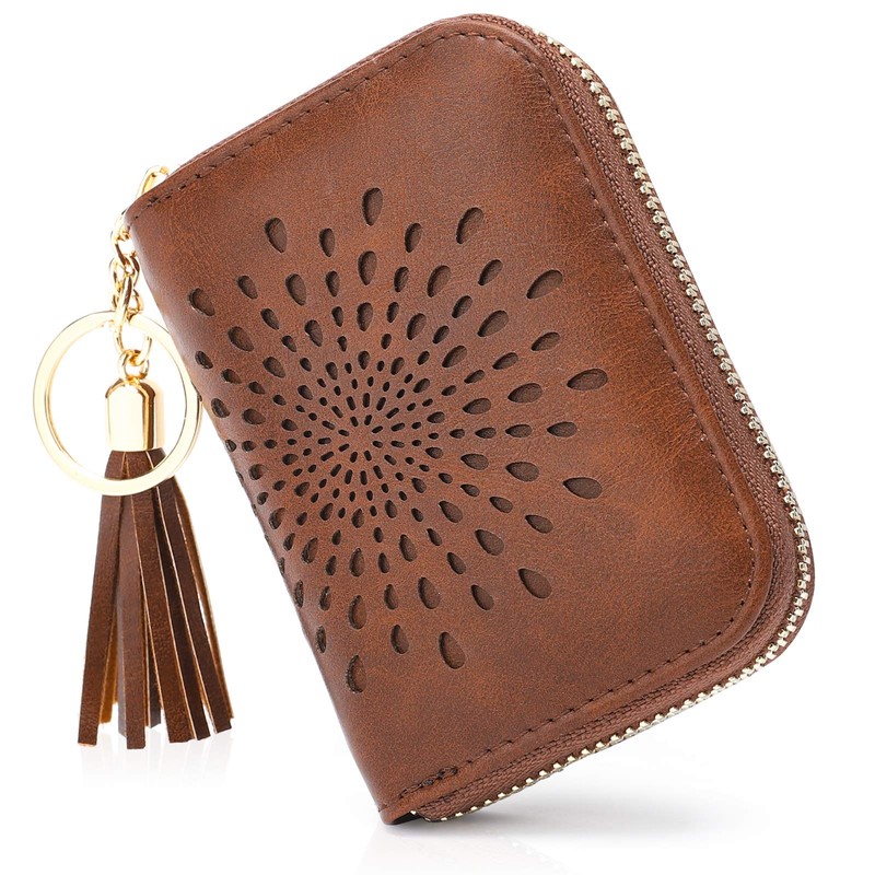 APHISON Credit Card Holder for Women RFID Blocking Card Case Ladies Small Wallets Zipper Purse 10 Slots Accordion Hollow Out Sunflower Tassels with ID Windows 1927COFFEE