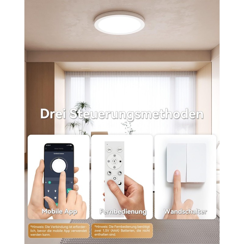 - Triple control for maximum comfort: this flat LED ceiling light can be easily controlled via light switch, remote control or the smartphone app. With the remote control, you can control brightness, colour temperature, night light and the timer function (15, 30 or 60 minutes), ideal for energy-saving operation. The "Lampsmart Pro" app allows precise settings via a simple Bluetooth connection - no Wi-Fi connection required.