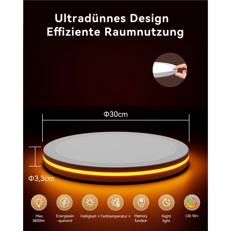 - Night light mode and intelligent memory function: the flat ceiling light has a soothing night light mode with soft, glare-free lighting, ideal for a comfortable sleeping environment. The built-in memory function stores your preferred settings such as brightness and colour temperature and automatically activates them when switched on again, even in night light mode.