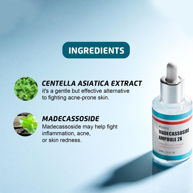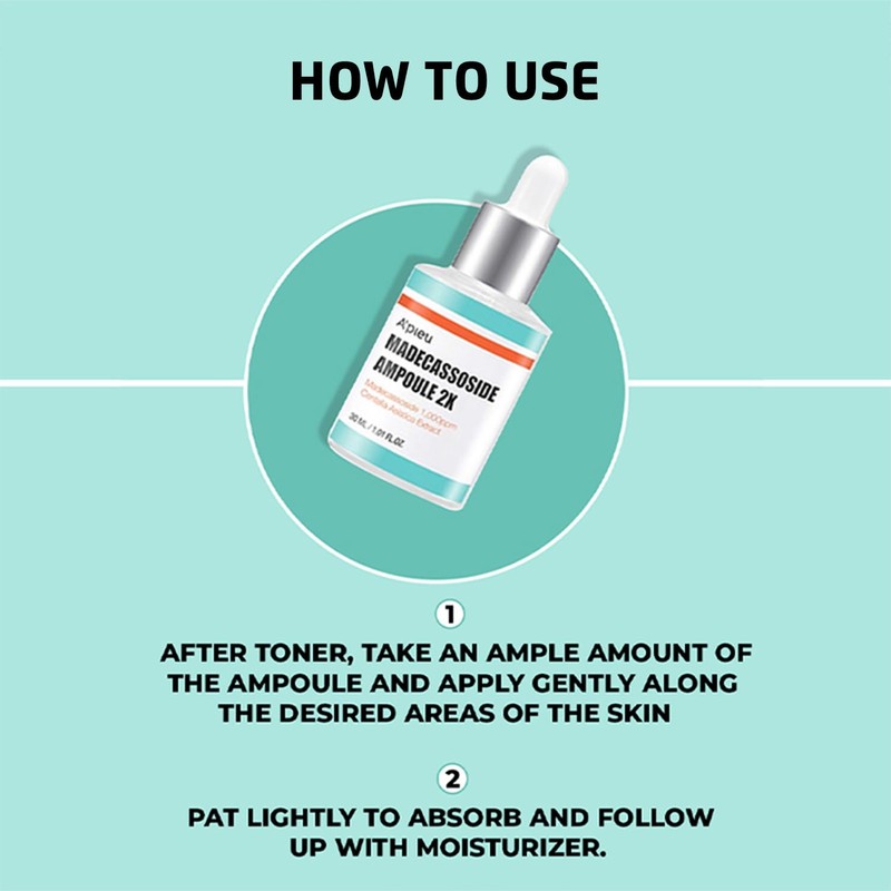 10 times stronger than the previous generation: A'Pieu Madecassoide Ampoule 2x improves and soothes the skin with concentrated Centella Asiatica extract for dry, damaged skin. 10.5% Centella Asiatica and 0.1% Madecassoside extract promote skin regeneration and soothe sensitive skin. Improves damaged skin by strengthening the skin barrier, giving it a protective film and protecting it from drying out. Free from artificial colours and fragrances. Freshwater ampoules provides a feeling of freshness on the skin - without sticking. Centella Asiatica and Madecassoside soothe the the skin. Gentle care for sensitive skin with antioxidant properties