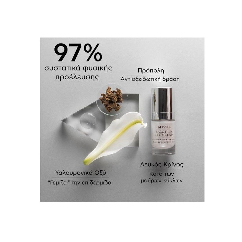 The Apivita 5 Action Eye Serum is an innovative eye cream serum. It effectively combines anti-aging and moisturizing actions, making it the ideal beauty product for every woman.