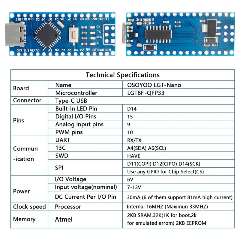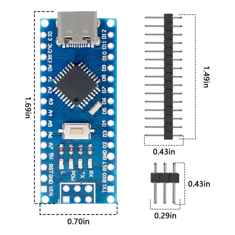 - 【Flexible Power Supply Options】: The module for Arduino can be powered by the Type-C USB port, an unregulated external 7-12V power supply (pin 30) or a regulated external 5V power supply (pin 27). The highest voltage source is automatically selected as the power source.
