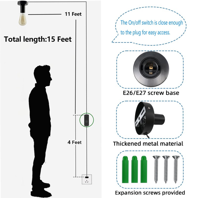 - 2pcs Hanging Light Cord for Garage: 15ft length extension cord with lamp sockets will be ideally wall lamp or ceiling lamp for garage, camera bulb. 80mm base save the space, make it very convenient