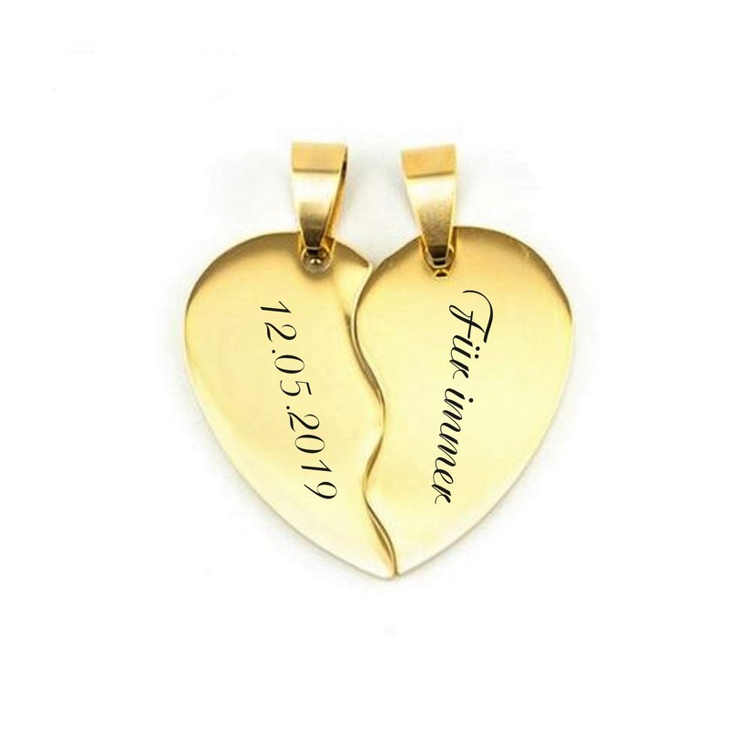 - ♥ Stainless steel split heart pendant with chain. Partner Pendants, Set of 2 in Gold or Silver. New Unisex. The engraving plate (halves of the heart) can be engraved according to your wishes.