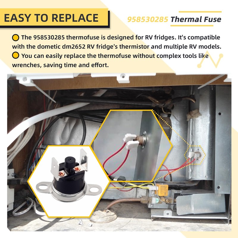 - Product Information:The 958530285 Thermal Fuse for Dometic DOMA FPR DM2652 Refrigerator, replaceable part number 3850870019, provides a safety mechanism for your refrigerator