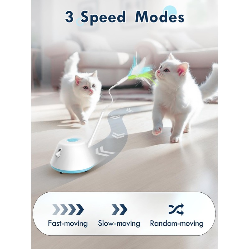 - Three Speed Modes: The moving cat toy features three play modes: fast mode, slow mode, random mode, which not only catering to your cat’s mood and activity level, but also ensuring freshness and unpredictability in play. It's an ideal interactive toy for indoor cats