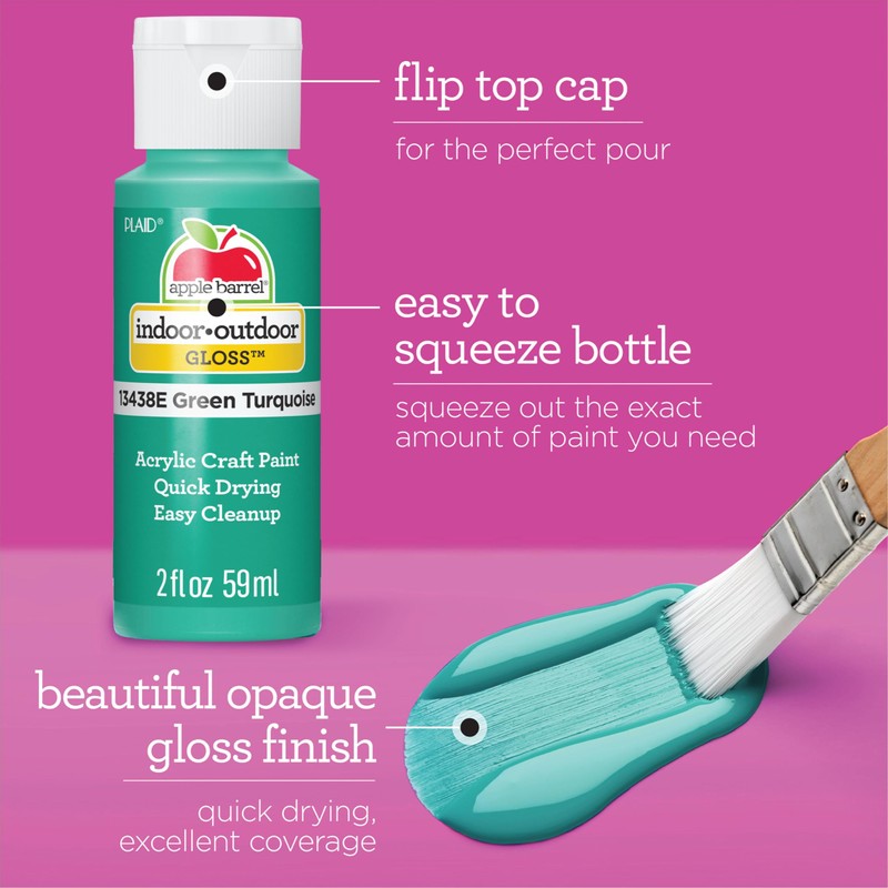 • VERSATILE, CONVENIENT ACRYLIC PAINT SET - This gloss acrylic paint set features a collection of 12 bottles, each containing 2 oz of vibrant acrylic craft paint. The colors included in this set are: Apple Barrel Pink Blush, Pure Pink, Real Red, Pumpkin Orange, Tangerine Cream, Light Yellow, Bright Green, Real Green, Green Turquoise, Tropical Blue, Light Blue, and Beachcomber Beige.