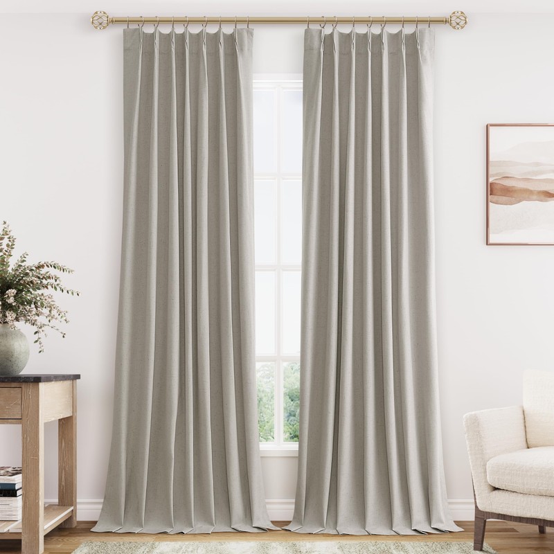 Pinch pleat Linen blackout curtains are made of linen blend fabric, suitable for living room, bedroom, kitchen, glass sliding door, dining room and many other scenes