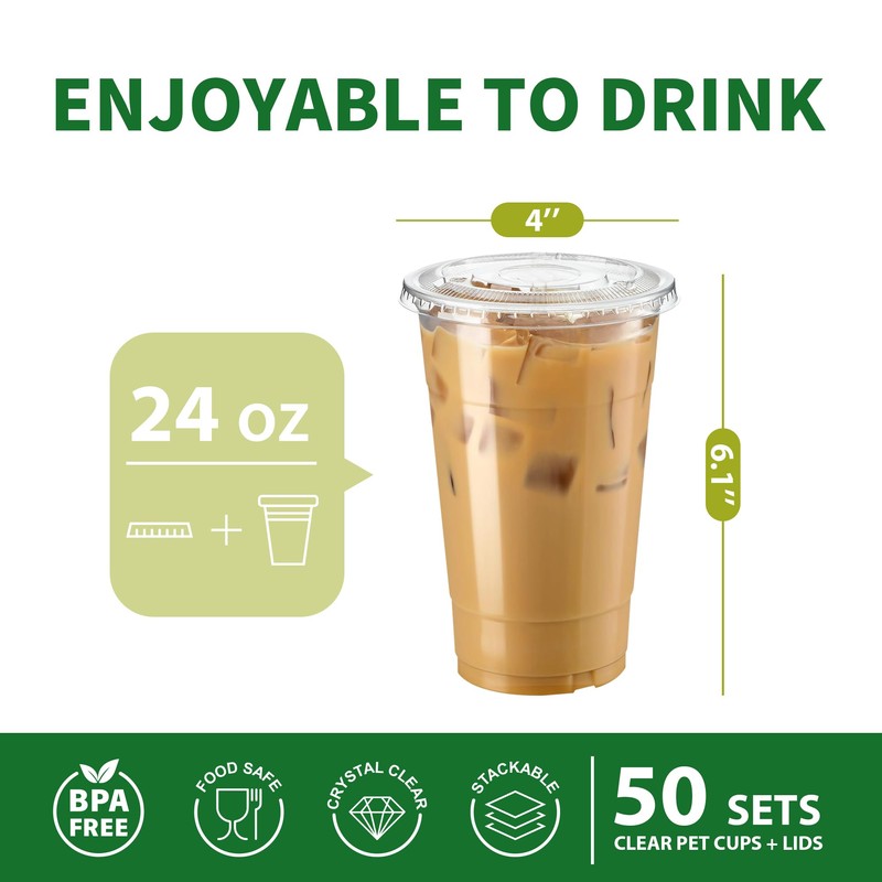 APSIC Clear Plastic Cups with Flat Lids, 50 Sets 24oz (100-Piece) Disposable PET Crystal Party Cups, Ideal for Iced Coffee, Smoothie, Milkshake, Juice, Dessert, To-Go Drinks and Cold Beverages