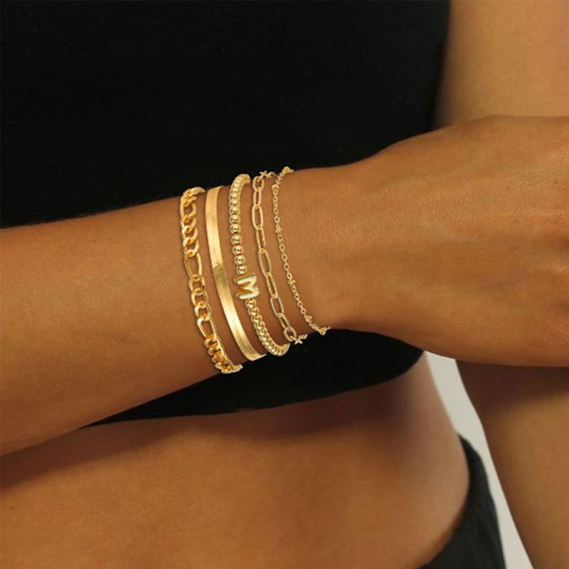 - [Gold Bracelet Stack] Womens gold bracelet set including paperclip bracelet, dainty bracelets, figaro chain bracelet, snake chain bracelet, gold beaded bracelets. Each gold chain bracelet can be worn separately and together, or layered with other bracelets to create their own style.