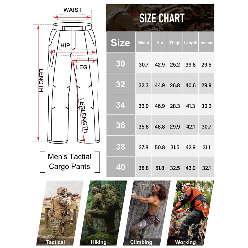 - [Durability and Versatility]Built to withstand the toughest conditions and terrain,our men's tactical cargo pants are designed for law enforcement,military,and outdoor enthusiasts.From rugged terrain to extreme weather,mens hiking pants offer superior durability and versatility,making them the ideal choice for any adventure.