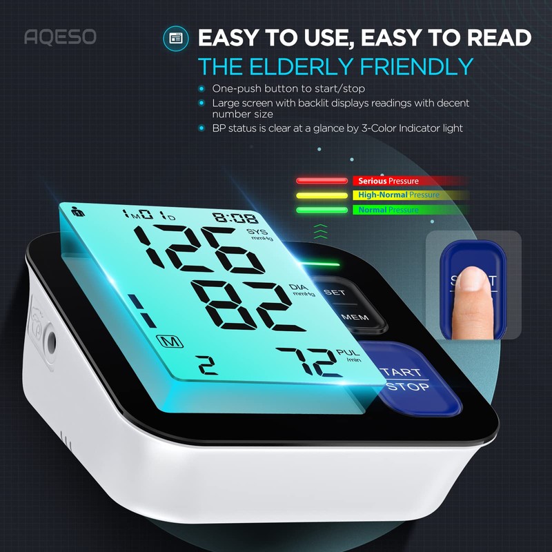 - Easy to Use, Easy to Read - The large with backlit LCD display provides clear, oversized readings, easier to see in dim light conditions, very friendly to the elders. One touch operation, AQESO BP monitor can measure your diastolic, systolic and heart rate automatically. The best thing is the bp cuff automatic functions with the arrhythmia (Irregular Heartbeats) detection. (Note: Arrhythmia would affect measuring accuracy)