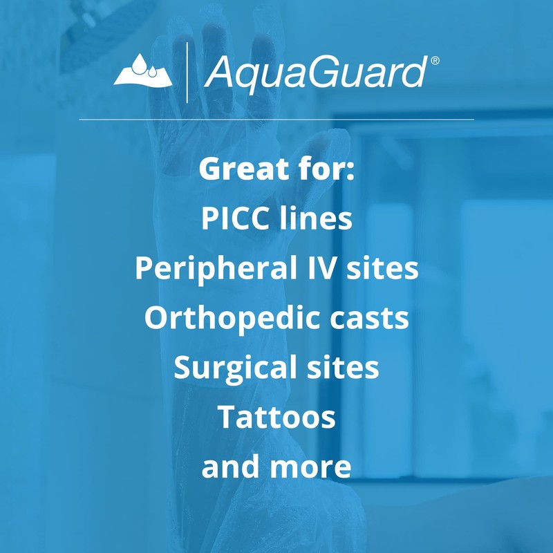 The AquaGuard Glove is a disposable waterproof barrier which is simple to apply with no assistance needed, allowing for patient independence while showering. The AquaGuard Glove was designed with the assistance of clinicians in hospitals to protect IV, surgical and wound sites when patients shower. The waterproof dressing provides a safe waterproof barrier when patients shower and is simple to apply and remove with no assistance needed, allowing for patient independence while showering. contains no adhesives and doesn't require uncomfortable rigid straps. Instead, the easy-to-use Water-Seal Band is used to create a waterproof seal with a simple auto-locking buckle. The Water-Seal Band allows the patient to freely use their arm as they normally would and keep their site dry while they shower. The AquaGuard Glove is 34 inches long and is large enough to protect most sites and dressings on the patient's hand or arm from becoming wet while showering. The Glove is designed to protect the dressings that cover all hand and arm procedures including: PICC Lines Peripheral IVs Surgical Sites Transdermal Patches Casts Each package contains 3 gloves and 1 reusable Water-Seal Band.