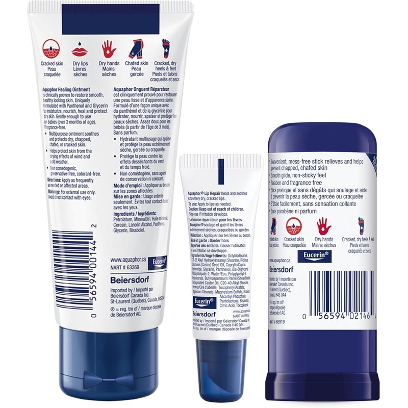 • INCLUDES: One 50 g tube of Aquaphor Healing Ointment, Multipurpose Ointment for dry, cracked skin; one 10 mL tube of Aquaphor Lip Repair Hydrating Lip Balm for cracked lips; and one 18.4 g Aquaphor Healing Balm Stick for chapped, chafed skin