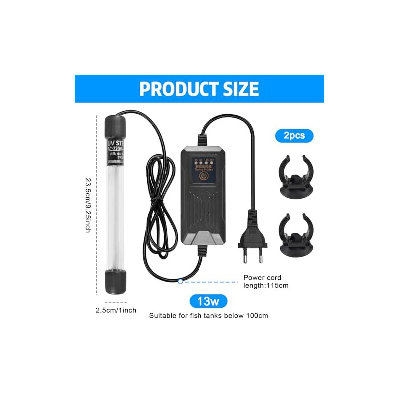 - Efficient disinfection: the aquarium UV steriliser light with timer kills over 99% of harmful bacteria and viruses and keeps the water clear and healthy.