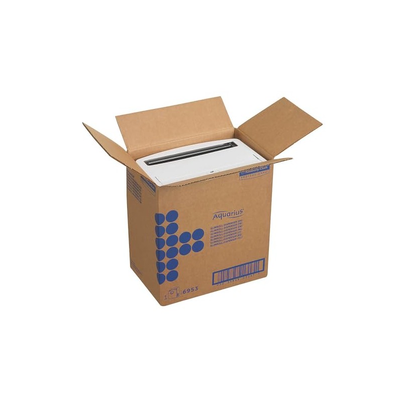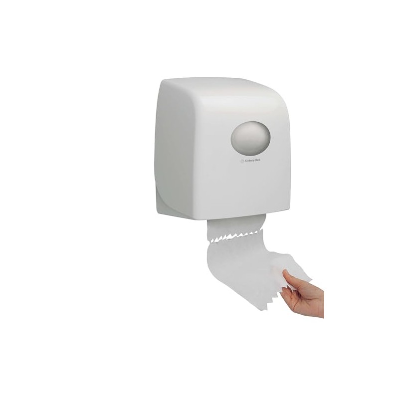 The dispenser for paper towels Aquarius* Slimroll number 6953 from Kimberly-Clark Professional* is ideal for any washroom. It is made of impact-resistant plastic. This disposable towel dispenser is white and has a transparent viewing window. Thanks to the practical viewing window, you can check with just a glance whether the dispenser needs to be refilled. The size of the dispenser is 34.3 x 31.8 x 19.0 cm (height x width x depth). You will receive a dispenser in one packaging unit.