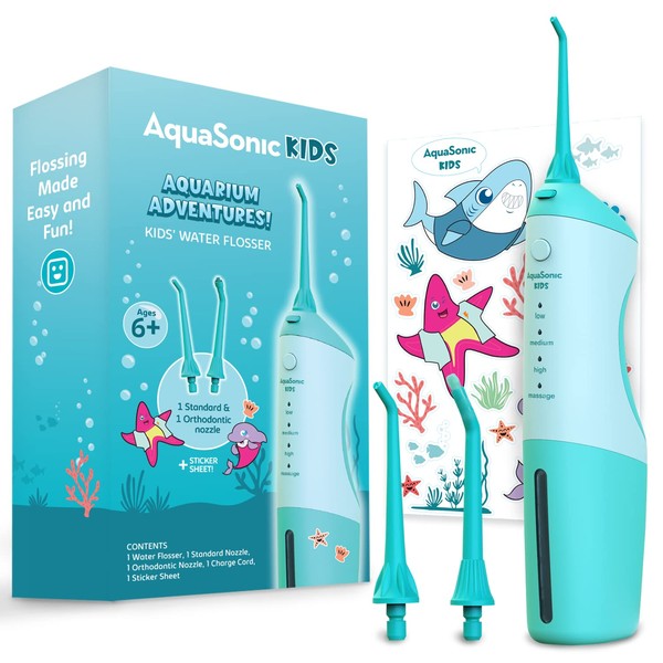 - This fun and colorful set includes extra nozzles and waterproof stickers, for a completely cusomizable flosser. It is sure to make flossing fun and engaging for your child while giving you peace of mind of a complete clean. Give your child the gift of healthy teeth and gums with the AquaSonic Kids' Water Flosser.
