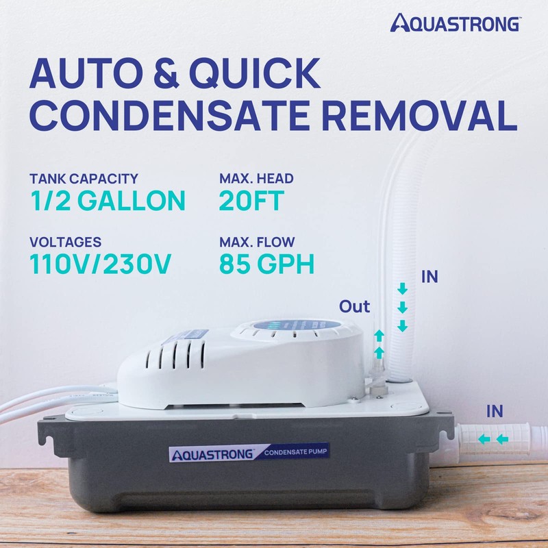 Aquastrong 1/38 HP 85 GPH HVAC Condensate Pump, 115V/230V, Automatic Safety Switch, AC Condensate Removal for Air Conditioner, Furnace, Dehumidifier, 3.3' Power Cord | AQUASTRONG