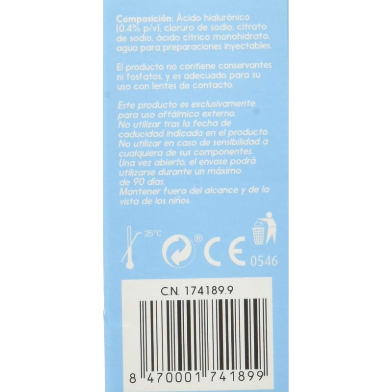 Properties of lubricants, moist agents and collection of hyaluronic acid relieve skin irritation, dryness, ardor and feeling of foreign bodies due to ecological factors (wind, sun, smoke, dry air), visual stress (excessive use of light, computer) or mechanical factors (use of contact lenses, after operations ocular lens), provides a lasting relief.