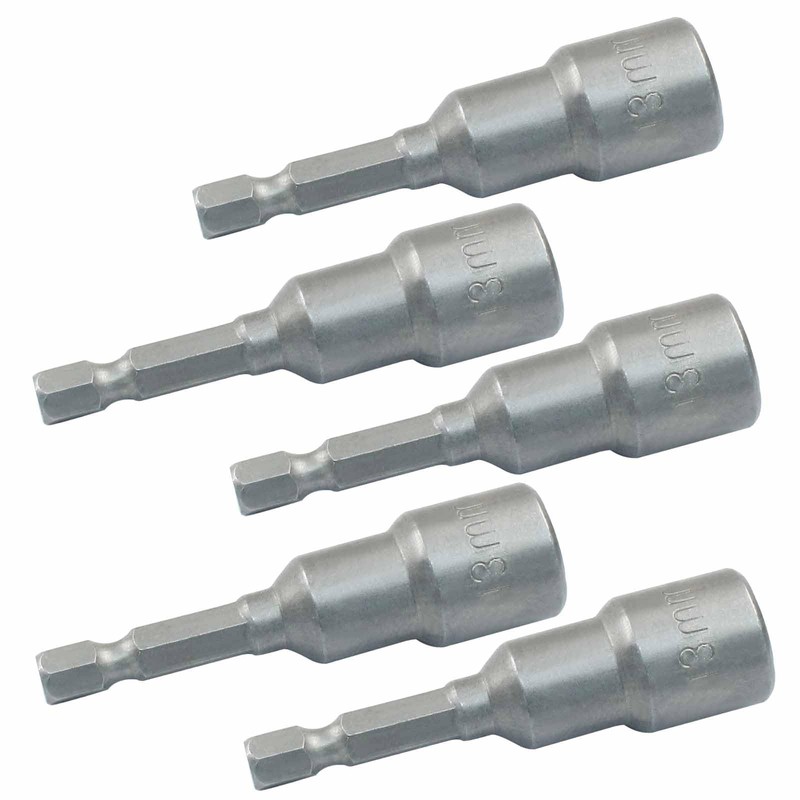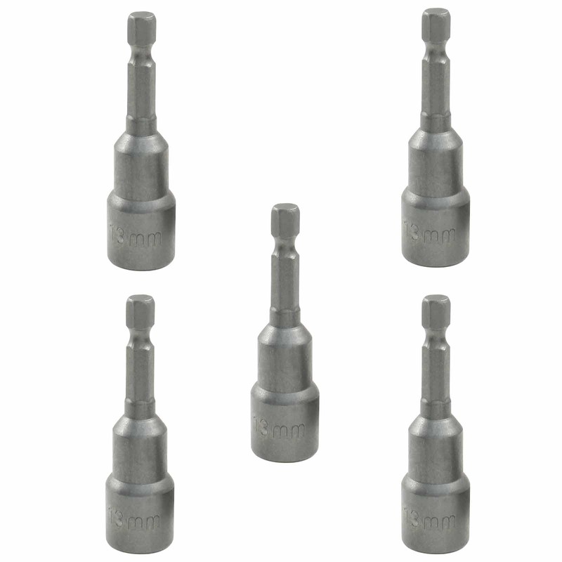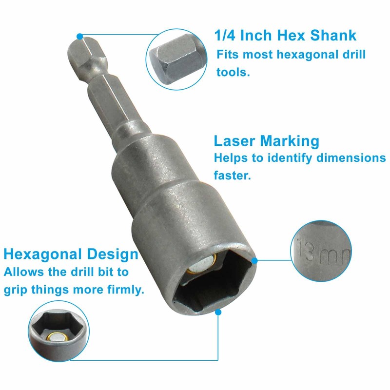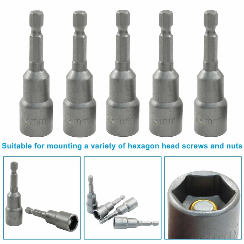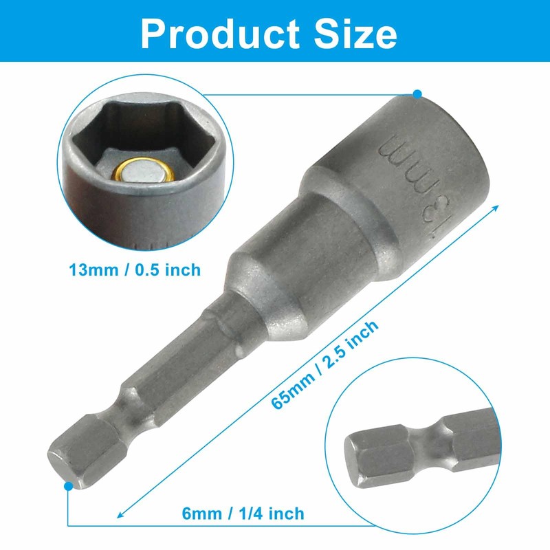 - Size: The nut driver bit has a length of 65 mm / 2.5 inches, 13mm / 33/64 inch nut driver and a 1/4 inch hex shank. Each pack includes 10pcs silver nut driver bits.