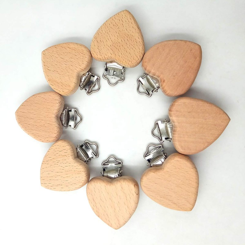 Arakierst 10pcs Natural Wood Suspender Pacifier Clips Cute Beech Wooden Animal Heart Shape Clips Charm DIY Beading Pacifier Chain Accessory