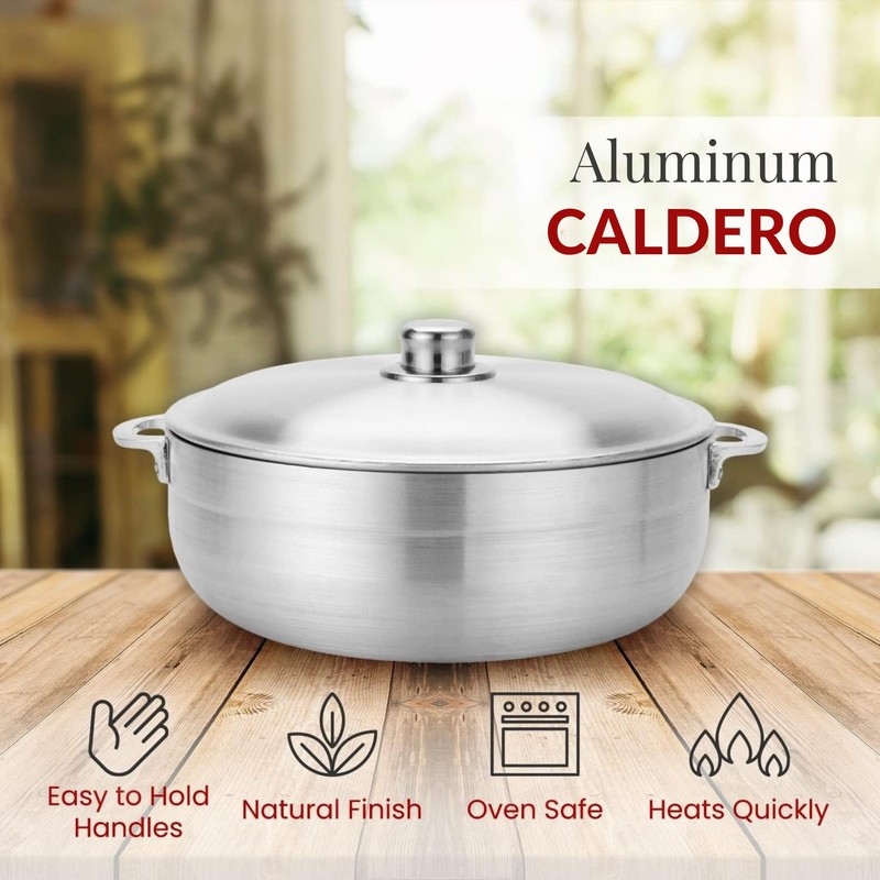 - HIGH QUALITY ALUMINUM CALDERO: A superior alpine aluminum dutch oven pot with a lid and handle makes cooking with it healthier. The Nonstick Caldero pot is ideal for everyday cooking because it conducts heat and makes cooking easier. It may be used in a variety of ways, including to make your favorite sauces, the ideal soup, vegetable stews, rice, and beans.