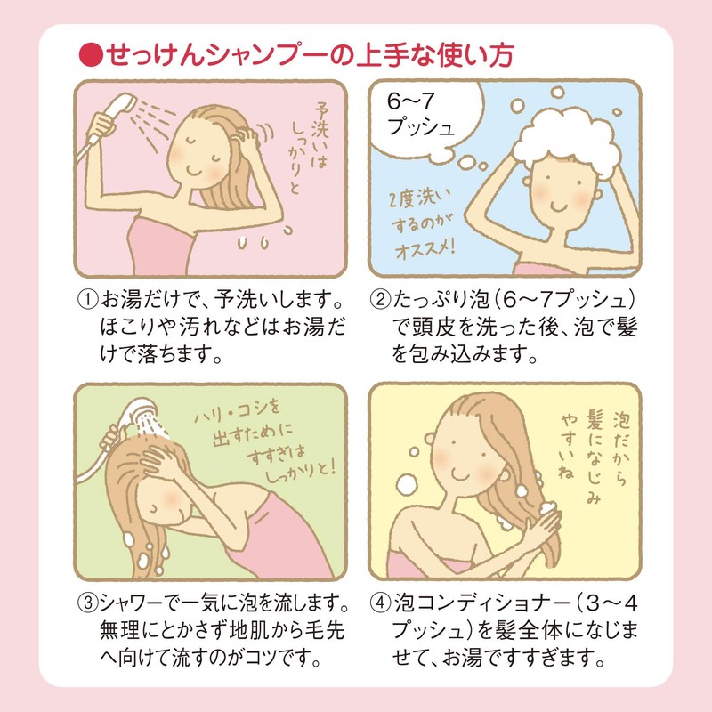 Vegetable cellulose (polyquaternium-10) adheres to damaged areas of the hair surface to create elegant and beautiful hair.Once it goes down the drain, it is biodegradable by microorganisms and quickly returns to the earth.No synthetic surfactants, fragrances, coloring, preservatives, etc. are used.