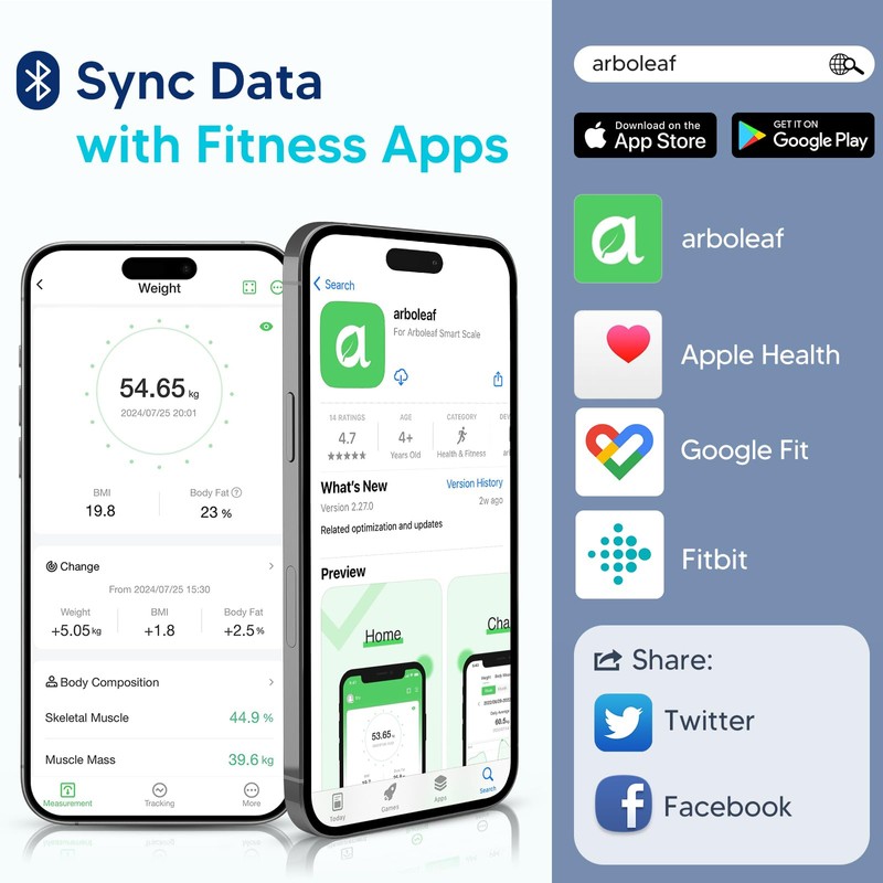 - Smart App Connectivity: Connect via Bluetooth to the arboleaf App for automatic data sync and tracking. The smart scale also syncs with Apple Health, Google Fit, and Fitbit, allowing you to share your fitness achievements on social media and encouraging friends and family to join your fitness journey