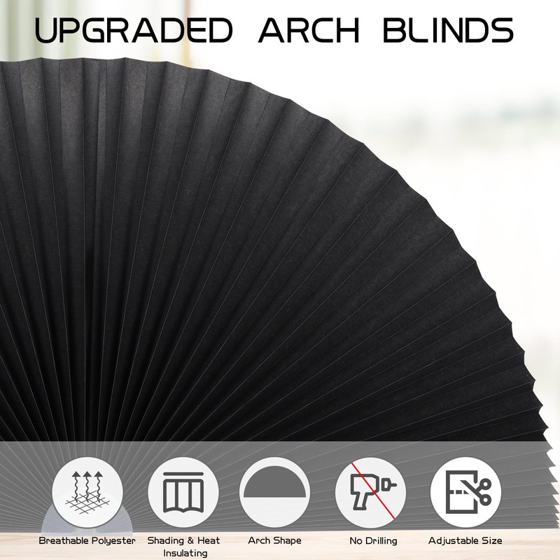 - 【Easy Installation】 -- No tools are required for installation. Simply peel and stick the adhesive strips into your window frame. The semi-circle shape of the window shade fits most windows, including arched windows, round windows.