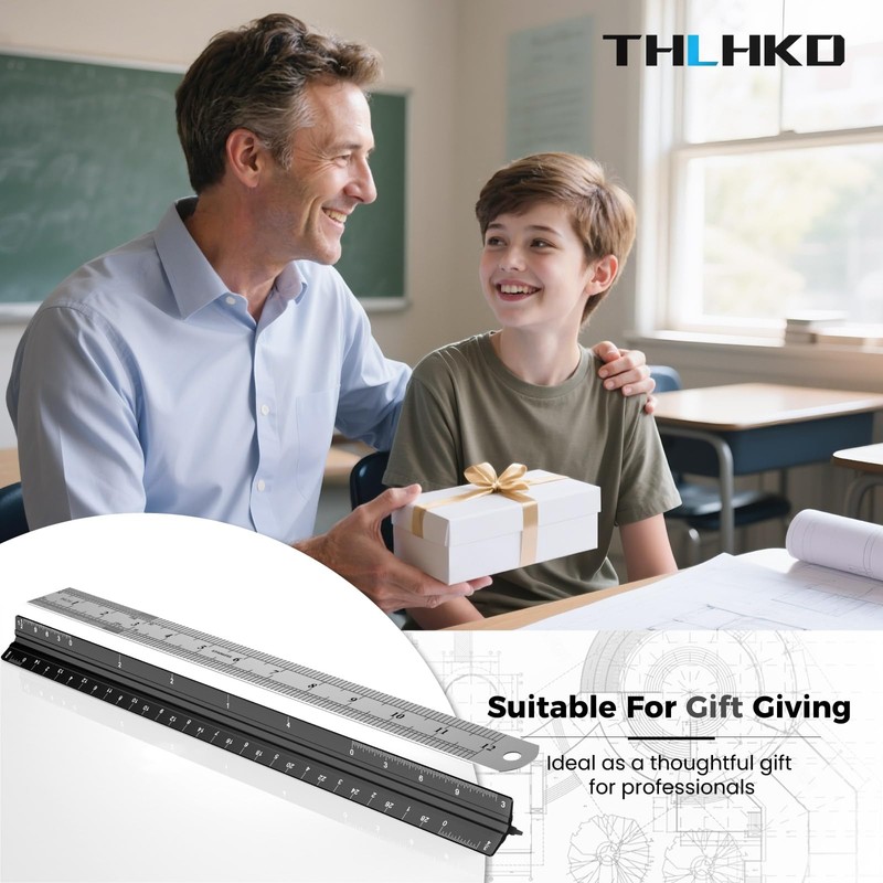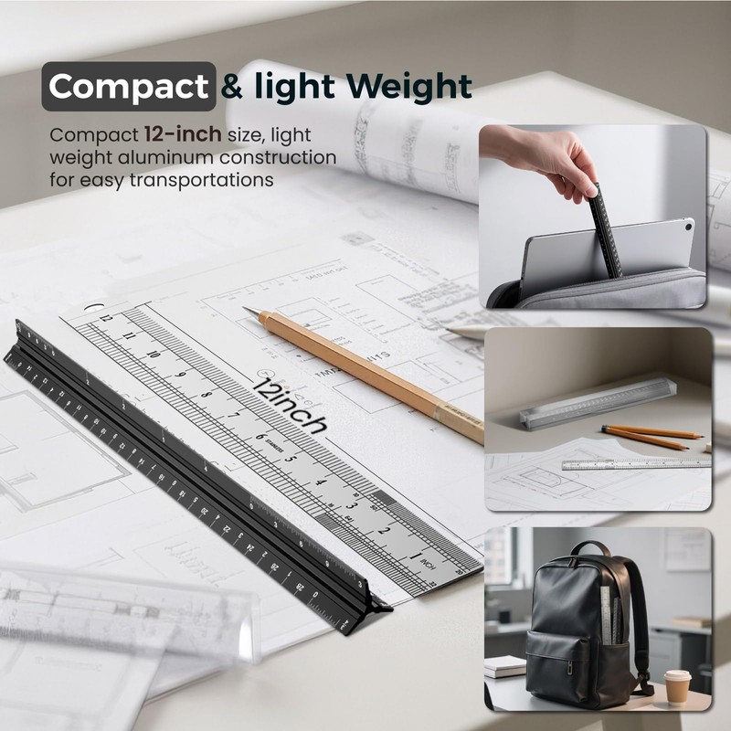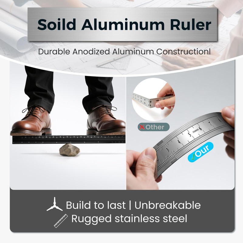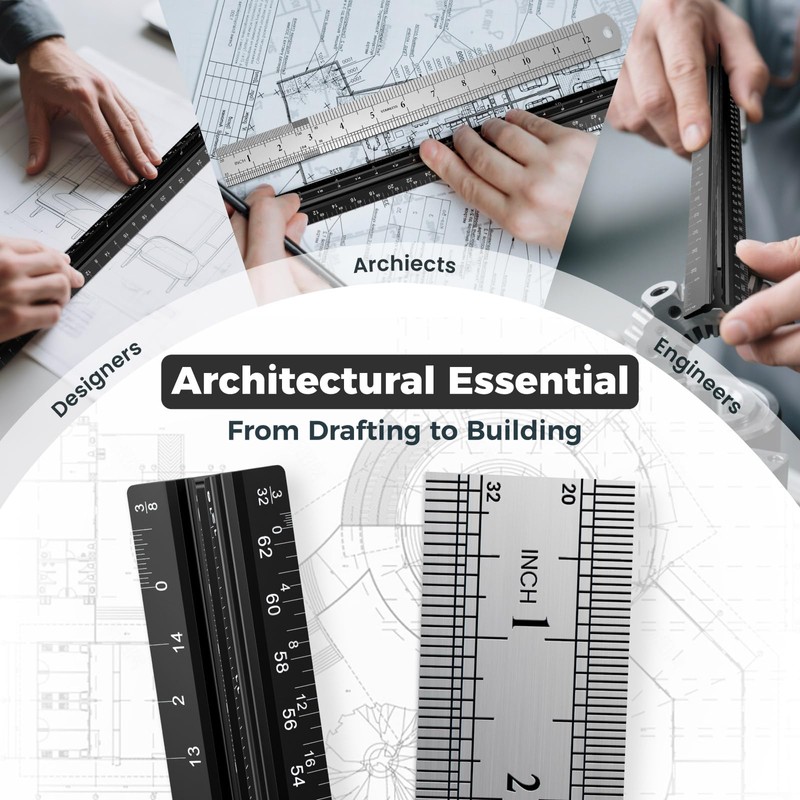 - Premium Metal Measuring Set: Triangular ruler in high-quality aluminum alloy for 1:16 scale measurement—lightweight, impact-resistant, and durable. The set includes a stainless steel ruler for 1:1 scale—flexible, durable, and wear-resistant
