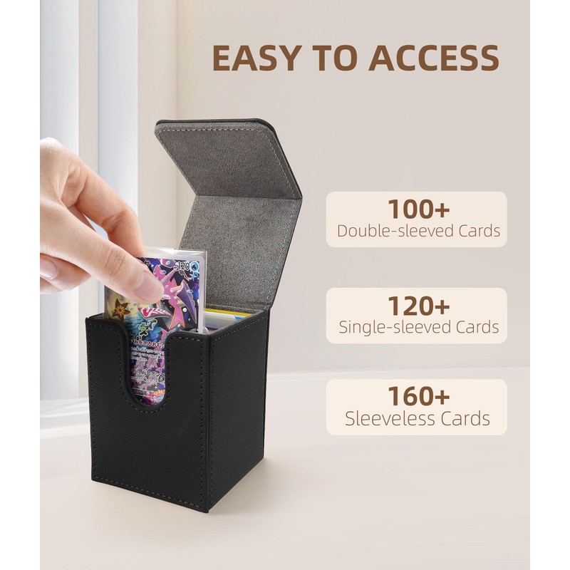 - U-shape Design: The box features a sided, wide-mouth U-shaped design; Even if the box is full of cards, you will be able to easily remove them all at once. The durable leather card deck box can hold up to 100+ double-sleeved cards, 120+ single-sleeved cards, or 160+ sleeveless cards.