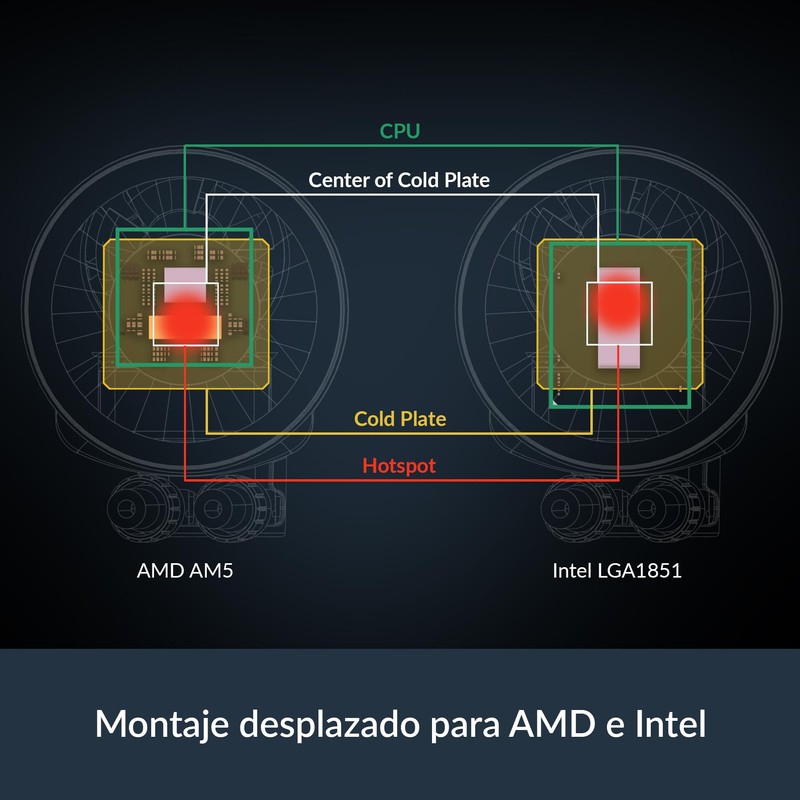 - NATIVE OFFSET MOUNTING FOR INTEL AND AMD: Shifting the cold plate center toward the CPU hotspot ensures more efficient heat transfer