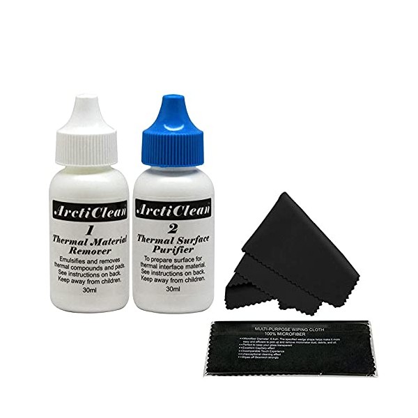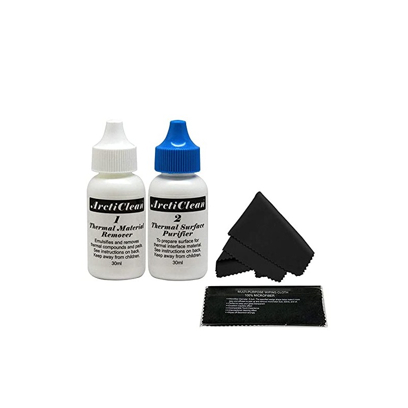 - Unique 2-Step Process: ArctiClean 1 Thermal Material Remover quickly emulsifies and dissolves the existing thermal grease or pad from the CPU and/or heatsink so that it can easily be removed with a clean cloth or paper towel. A few drops of ArctiClean 2 Thermal Surface Purifier and some gentle wiping then removes the remaining residue and inhibits flash corrosion on copper or aluminum.
