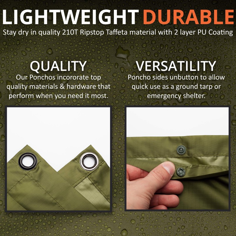 - MULTIPLE USES: Great rain gear for hiking, backpacking, and camping. This multi-use rain poncho can also be used as a tent, lean-to shelter or ground cloth.