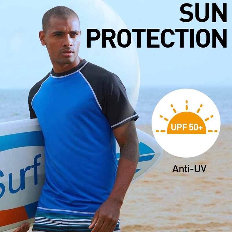 - The men rashguard carry a UPF rating of 50+,blocking out 102% of the sun's harmful ultraviolet rays.It can protect your skin from sunburn and maintain the healthy state of your skin.
