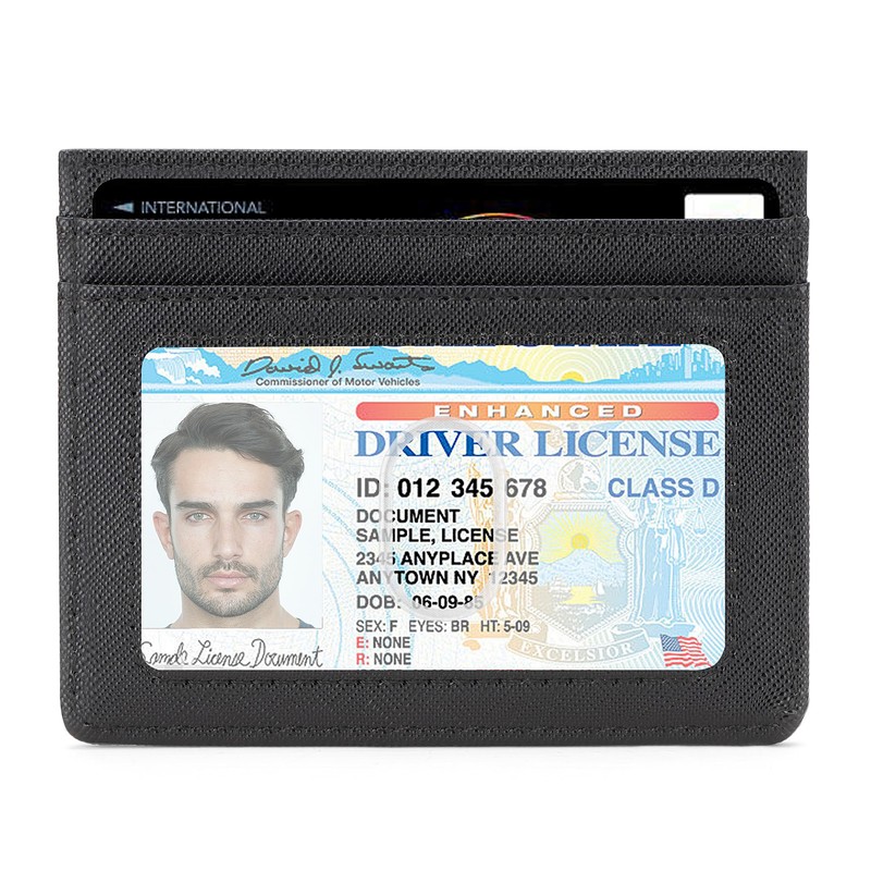 • Horizontal: 4 card slots, 1 ID window and 1 slip pocket; Vertical: 6 card slots, 1 ID window and 1 slip pocket