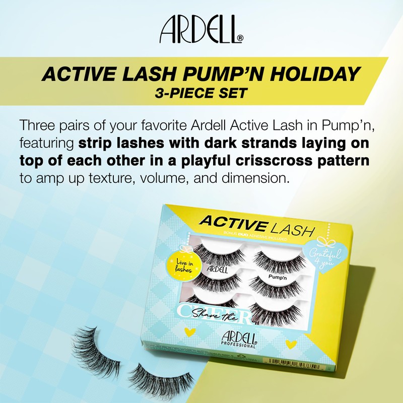 - 3-Pack Active Lashes Set: Ardell’s fitness-friendly Active Pump’n lashes in 3 pairs per pack. Delivers medium volume, instant eye lift and sweat-proof lash wear. Designed for active lifestyles and on-the-go lash users. Includes Active DUO Clear Adhesive.