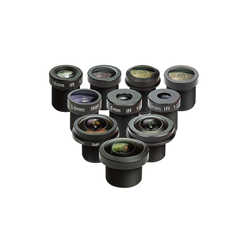 - What’s in it: This kit includes 10 M12 Lenses to cover almost any angles of view you’ll ever need, 10°/20°/40°/60°/80°/100°/120°/140°/160°/200° respectively on a 1/4” Pi Camera like OV5647 and IMX219. M12 lens holders, screws, specifications and even cleaning cloth are also in the box