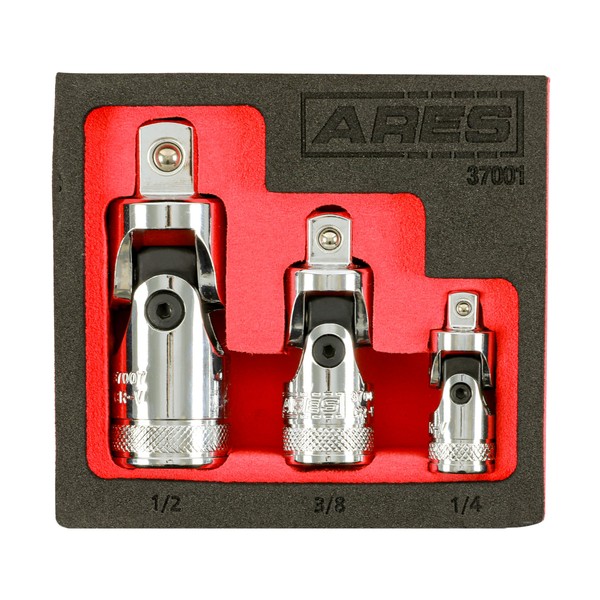 ARES 37001-3-Piece Universal Joint Socket Set - Includes 1/4-Inch, 3/8-Inch, and 1/2-Inch Drive U-Joints - Storage Rail Included